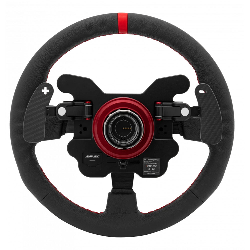 330-миллиметровое рулевое колесо для симрейсинга Simagic GT1 легкое и весит всего 1,45 кг. Оплетка руля выполнена из кожи, а в местах хвата прострочка прерывается, что обеспечивает максимальный комфорт при длительном использовании. Подрулевые лепестки из карбона прочны, невесомы, плавно переключаются и позволяют максимально погрузиться в процесс вождения.